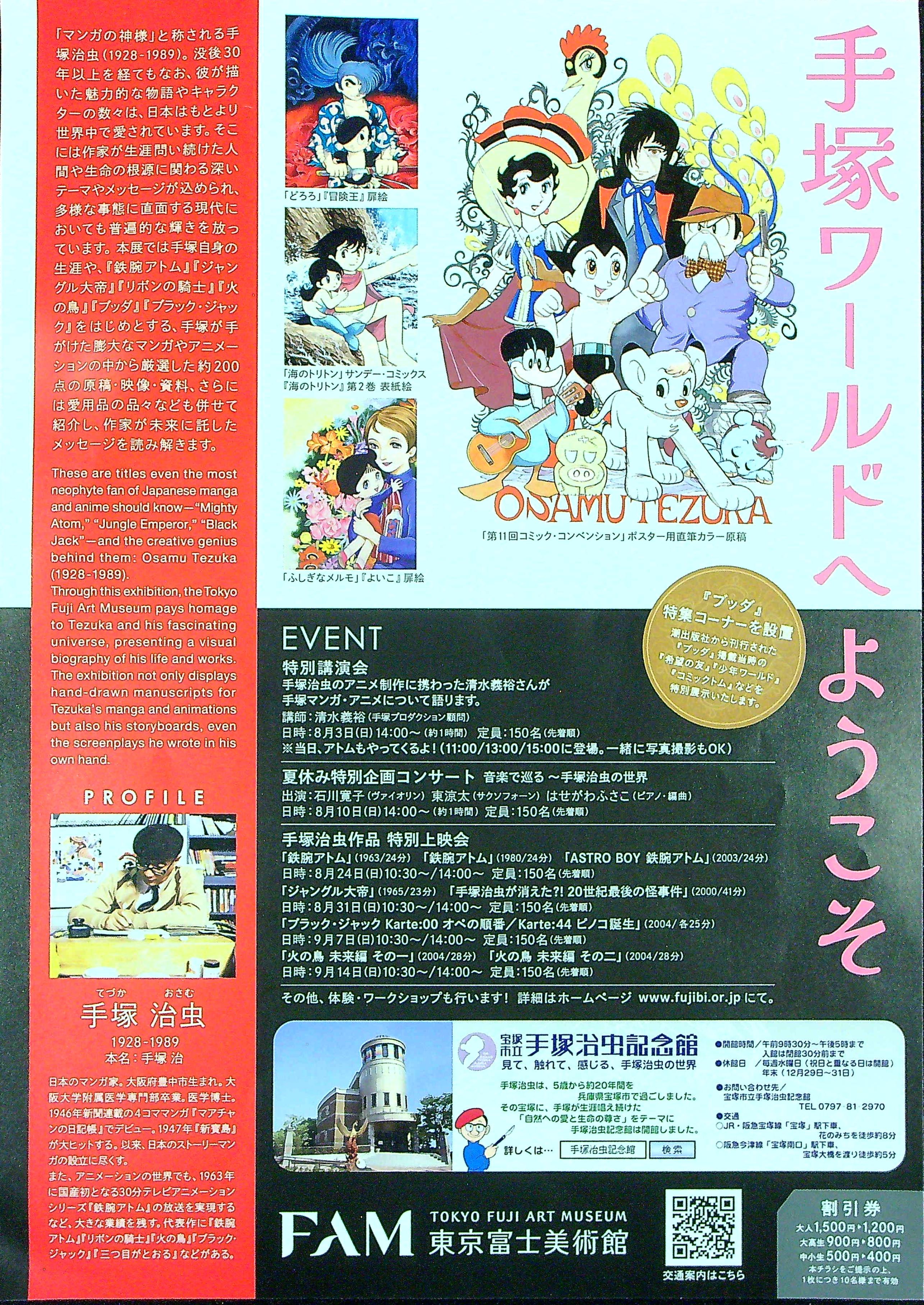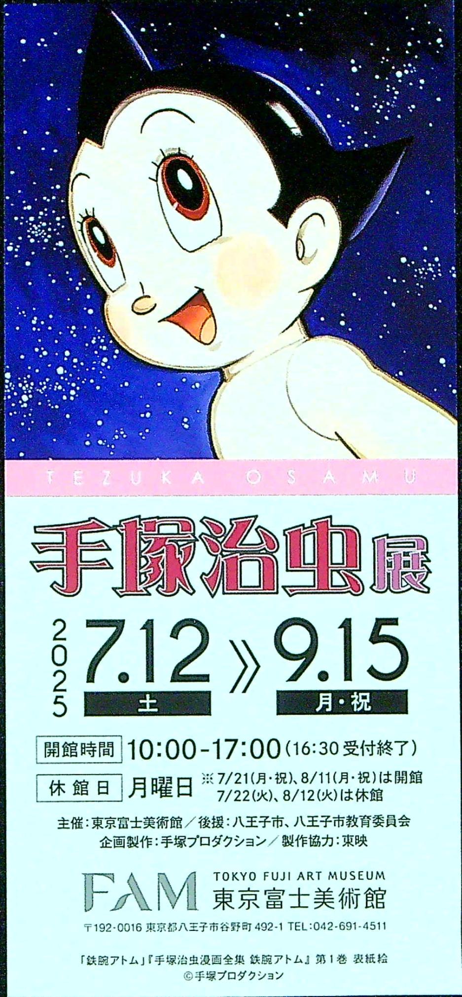 | 07月12日〜09月15日 | 手塚治虫展 | 東京富士美術館(後援:八王子市,八王子市教育委員会) | 東京富士美術館 | チラシ表面,チラシ裏面,入場券 | |