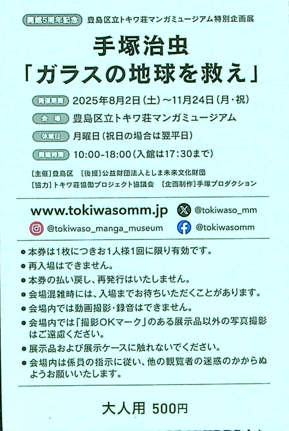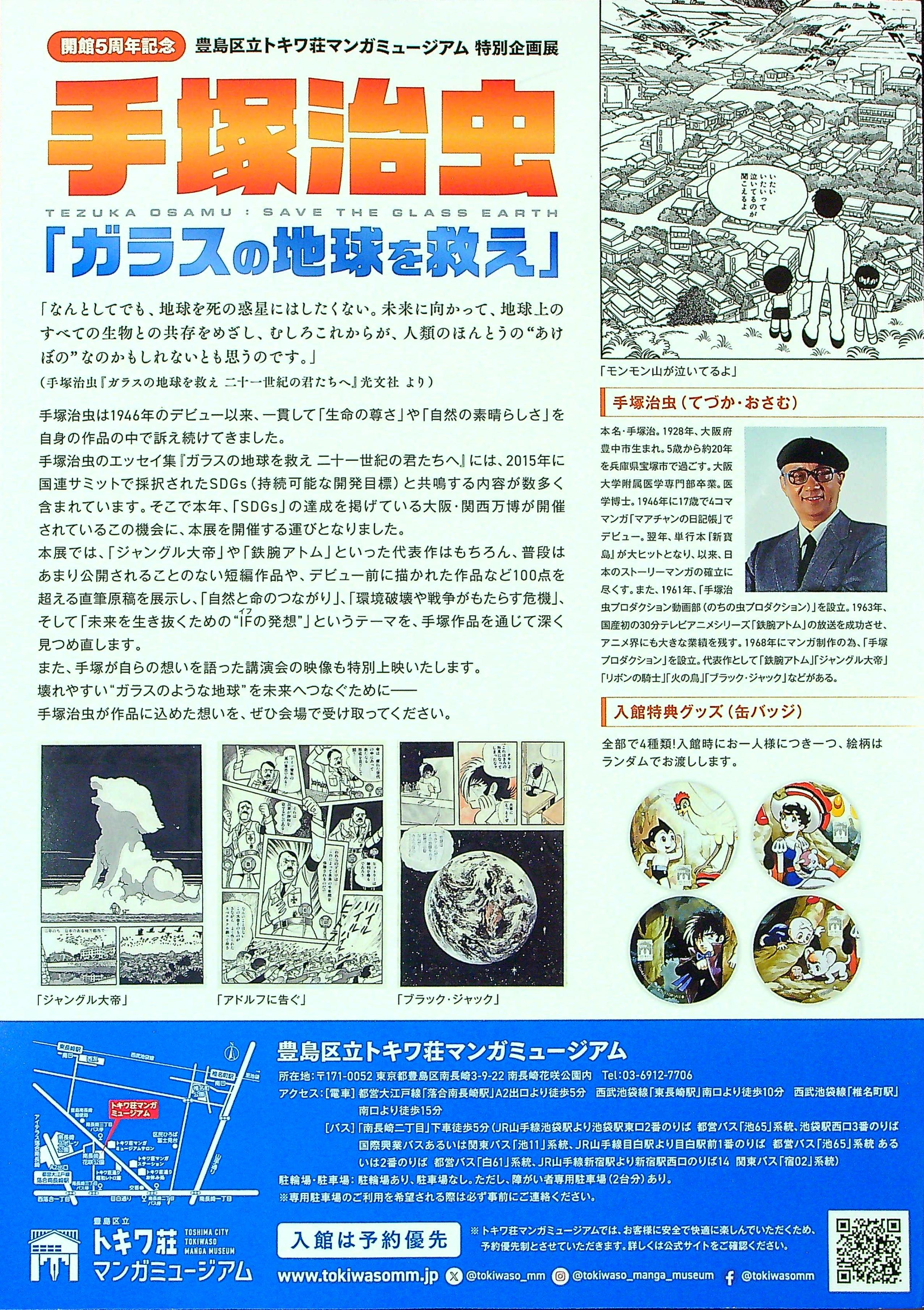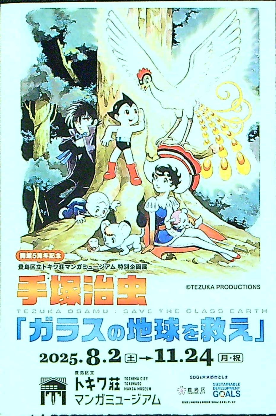 | 08月02日〜11月24日 | 「ガラスの地球を救え」展 | 豊島区(後援:公益財団法人としま未来文化財団) | 豊島区立トキワ荘マンガミュージアム | チラシ表面,チラシ裏面,入場券表面,入場券裏面 |